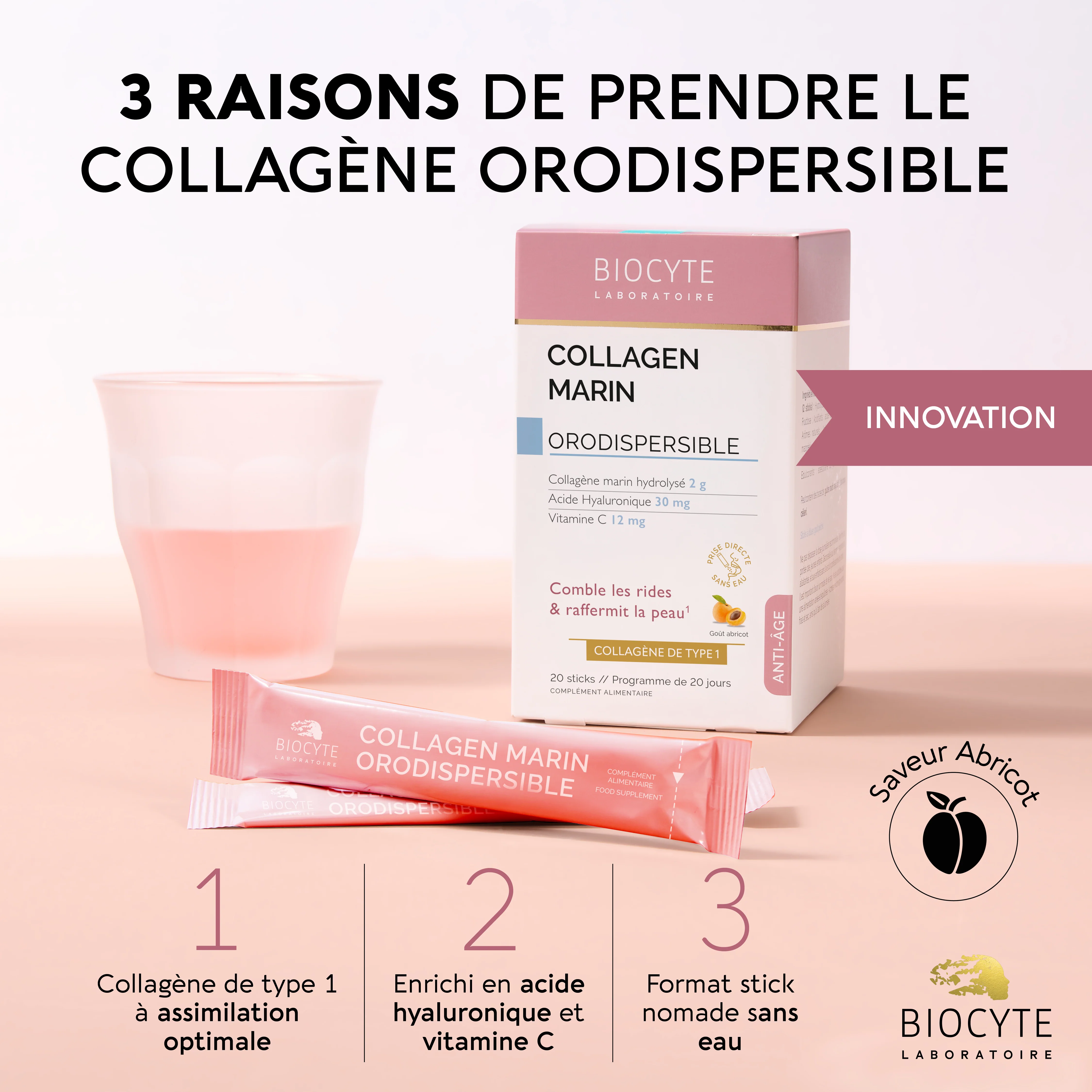 Le Collagène Marin Orodispersible de BIOCYTE est une innovation, unique en France. Conçu pour soutenir la fermeté et la densité de la peau, en réponse à la perte naturelle de collagène qui commence dès l'âge de 25 ans. Ce format facilite l'observance grâce à son format nomade, sans besoin d'eau, et sa saveur abricot.
