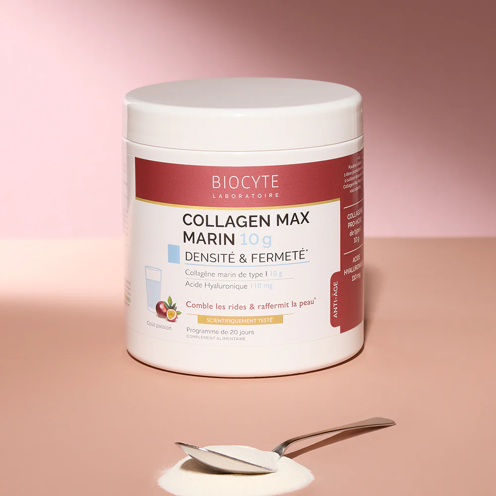Le Collagen Max Marin de Biocyte est un complément alimentaire innovant conçu pour combler les rides et raffermir la peau. Formulé à partir de collagène marin PRO-HCOL® hautement dosé et d’acide hyaluronique, il offre une double action hydratante et booster de fermeté.