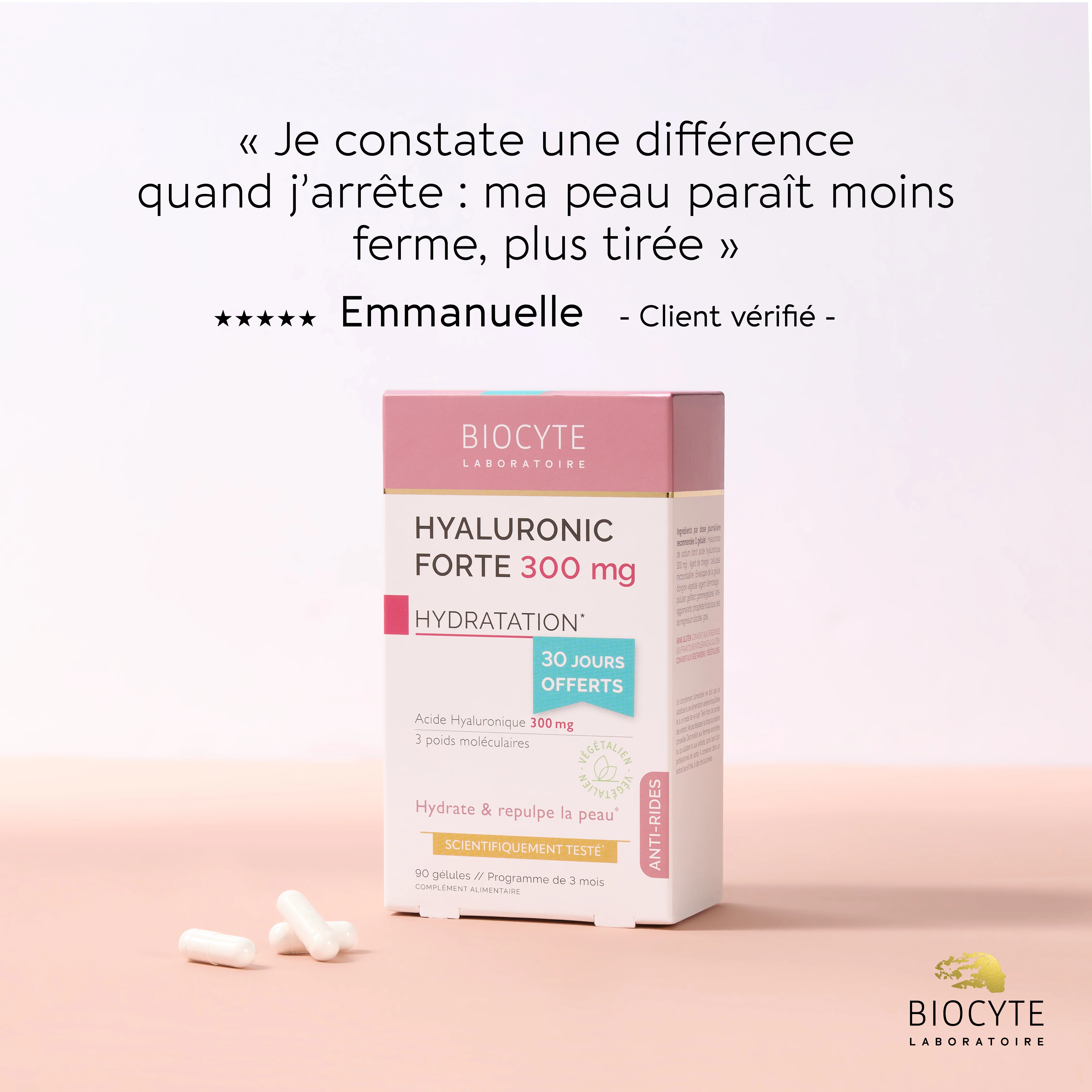 Hyaluronic Forte 300 mg de Biocyte est un complément alimentaire conçu pour hydrater et repulper la peau en profondeur. Formulé à partir d'acide hyaluronique de différents poids moléculaires, ce produit agit à la surface et en profondeur de la peau pour une efficacité anti-âge optimale. L'acide hyaluronique, obtenu par biofermentation, est capable de retenir jusqu'à 1000 fois son poids en eau, assurant ainsi une hydratation intense et durable.